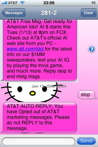 One. I pay for wireless service, not ad-supported wireless service, and I pay a lot for it. Two. It’s irrelevant that the text was free and did not apply to my limit. It’s okay for AT&T to send messages to verify changes to my account or something, but it’s not okay to annoy me with advertising. Three. Of all things, they sent an advert for…American Idol? I think that might be what pissed me off the most of all because it’s an idiotic program, and I’d rather have Billy Mays spend an hour trying to sell me a Sham-Wow than watch even one episode of American Idiot (and I think that both Billy Mays and the headset-wearing dumbass who actually hawks the Sham-Wow should DIAF).