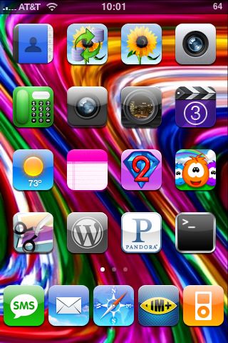 I finally got up the nerve to change some of the default iPhone and installed app icons that I didn’t like. I’d seen themes and knew I could change those, but there was always something about a theme that I didn’t like, and since it was usually some of the icons, it made just as much sense to change the defaults (and get to use my own wallpaper, regardless of whether a theme had included wallpaper or not), so that’s what I did. I was reluctant at first because when I ssh’ed into the phone and copied the default icons, they were PNG by file extension, but not “ordinary” PNG because I couldn’t open them, so it was obvious that Apple had added a little extra “love” to them, and I wasn’t sure whether the app might complain if the fie size was wrong, or the “Apple love” was missing. I tested the YouTube icon first (don’t care much about that) and it was fine, so I did the rest. For now, I decided to leave the iPod icon alone (it wouldn’t change, presumably because it lives on the dock), but if it bothers me, I’ll change it, too. This is only my first page, but I replaced the ones I didn’t like on all pages. Yay for a non-ugly Contacts icon, a non-boring Phone icon, and a non-lame Darkroom icon! I love messing with stuff like this! 🙂