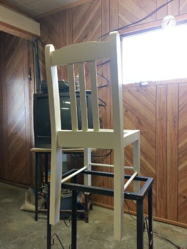 I got the first coat on last night, and just finished the second this morning. I have laundry and ironing, of course, but may be able to get the seat for this one done today, too. Won’t be able to put it on until the paint has had a week or so to cure (mebbe…hehe), but it’ll be done. I found a reasonably-priced epoxy to do the table top, so I think I’ll at least give it a shot. Worst case, I’m out the cost of the paint because if I don’t like it, I just won’t do the epoxy and I’ll make a new tabletop from pine and stain it maple like the rest of the furniture in that room.