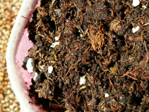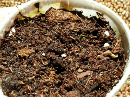 Tentative good news is half a dozen tiny seedlings from my Dixie cups of hardy fuchsia! Lots of opportunity for them to crap out on me yet, but they are green! (Look with one eye.)