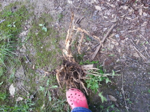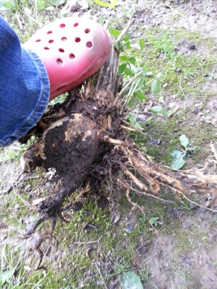 Also, fuck bush honeysuckle. This one had been cut back several times before, but it dared to come back after I whacked it down a few weeks ago. It was right against an Osage-orange tree and took a shovel, my composite trowel, my loppers and a hatchet, but I finally got it. I put it on the patio as a warning to other sprouting bush honeysuckle.