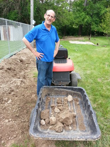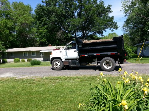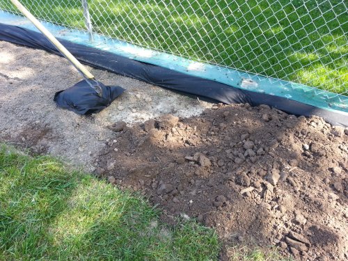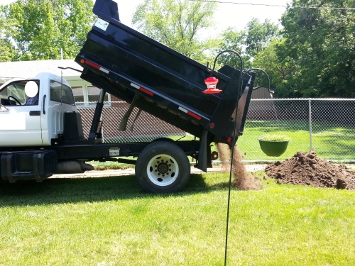 A dump truck is about six cubic yards. I knew it was a fuck of a lot of dirt, so I started installing the landscape fabric, and got to shovelling right away.