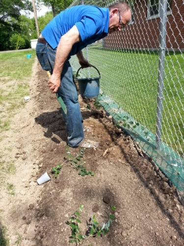 Finally, it was ready to put in the honeysuckle, which was getting pretty sick of sitting there in tiny pots with roots barely protected. We had to work fast, too, because the goddamned sun decided to come out, and the cups are only translucent. Fine in a greenhouse where roots are shaded, but lying down in direct sun…not so much.