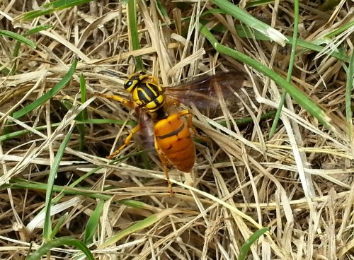 When I saw a large wasp-looking critter, poking around the ground, I thought, “Oh, a cicada killer,” and didn’t think more of it. When I looked at the picture, though, I thought, “Hang on…that’s not a cicada killer!” Nope…it’s a yellowjacket, and the reason I didn’t recognise it as such immediately is because it’s: A. a southern yellowjacket (Vespula squamosa), not Eastern (V. maculifrons); and, B. a queen. Big bitch; hope she didn’t decide my yard is a good place to make a home. I don’t mind a yellowjacket or two, but a nest they’re ready to defend…no.