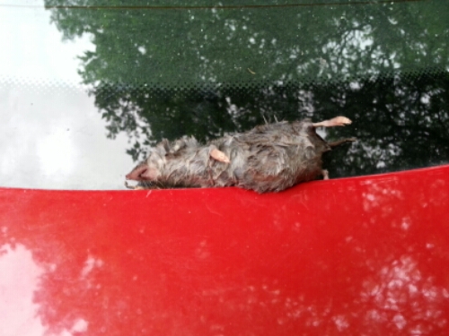 It was raining when I left, and I figured the mole would roll/blow/rinse off when I got out on the one-way in the rain (which turned heavy). This was on the back window when I got home.