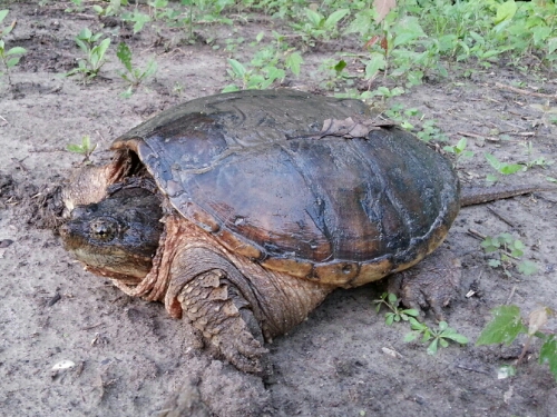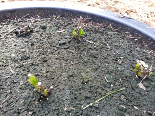 Rosemallow seems to really like its little swamp. Actual leaves, and activity from one of the small ones; I think I inadvertently buried its leaf nodules (or whatever the hell those bumps that will sprout leaves might be called).