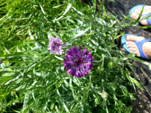 I thought I’d bought all blue bachelors button because that’s what P likes, but some of them did not get that memo. This is a lovely shade of purple, though!