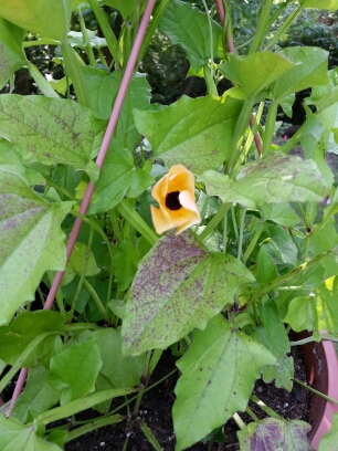 Every time I’d walk by the Thunbergia (sp.?) I’d tell it, “Quit making so many goddamned leaves and BLOOM, willya!” Finally, it did.