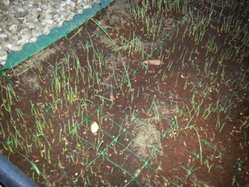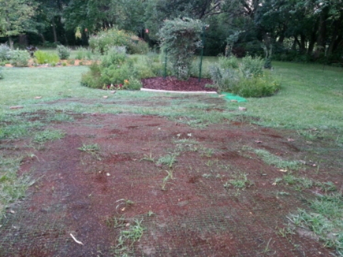 Yesterday, D. brought over a kitten she didn’t want, and talked for a while, and then I had to clean and fill the MLB feeders, so I was too late for pictures by the time I’d finished; it was dark. All I did was seed the rest of the bare spots anyway, but I want to document it here so I know when I did it. It’s still not level but the weather will be in the mid-to-high 70s this week, and I’m fucking tired of looking at dirt. It’ll be green and level enough to mow; that’s good enough.