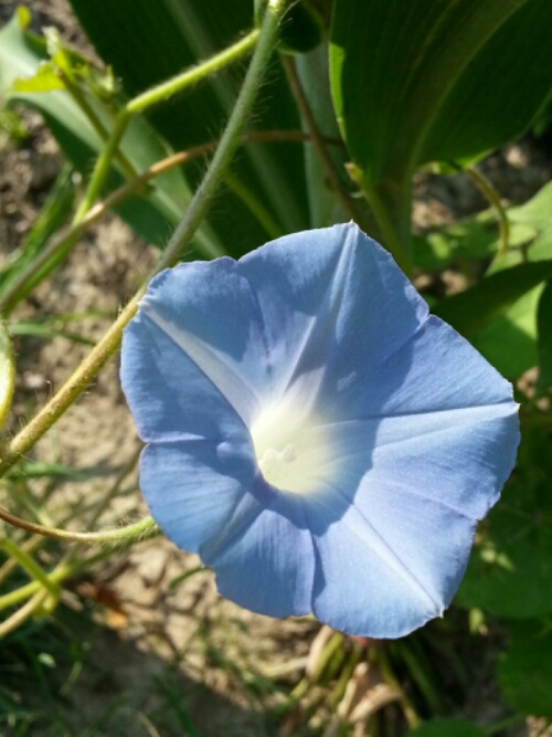 Probably the only morning glory I’ll see in my yard this year, thanks to Charlotte, and it’s not even one I planted. It’s the oak leaf morning glory that I left growing on the volunteer corn by the fence.