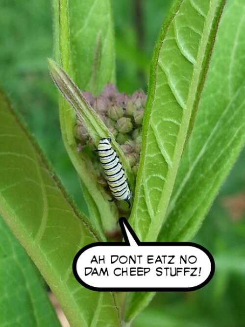 Poor little guy. I found him this afternoon, but when I came back a few hours later, in his place was a Psillopsis assassin bug. 🙁 He was on my expensive ‘Soulmate’ milkweed. I’ll add a picture of the culprit if I think of it later.