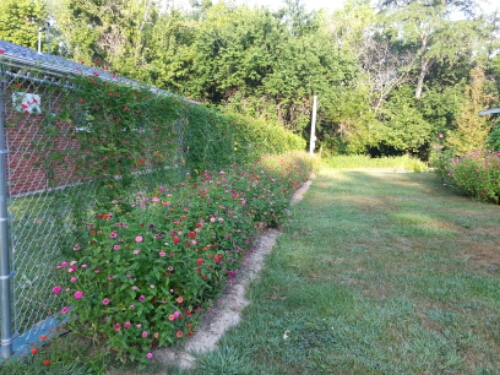 Here’s the fence. I do keep E’s side pretty neat–I go over at least every other day and weave errant vines back through the fence–but I’m more lax about my side, and it shows. I still think it’s pretty, though.