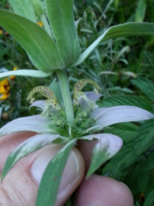 I knew these leaves were some kind of bee balm, but I thought they were just the ordinary purple Monarda fistulosa that I’ve got growing everywhere. Nope–these are the spotted bee balm, Monarda punctata! I didn’t plant many of their seeds, but I will next year because they’re really quite lovely. Flowers aren’t showy, but the leaves are pretty, and I like the shape of the plant.