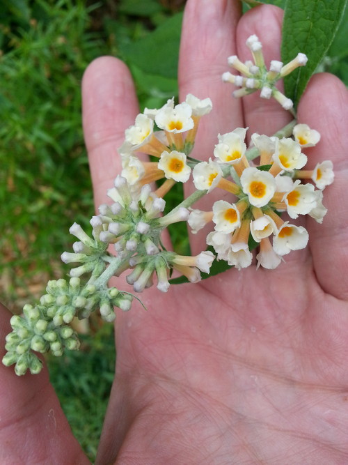 Golden Glow butterfly bush. It is sprawl-y, but I won’t know until next year whether that’s just the way it grew potted or whether that’s its growth habit. If it’s the latter, I’ll have to move it. Blooms are pretty either way!