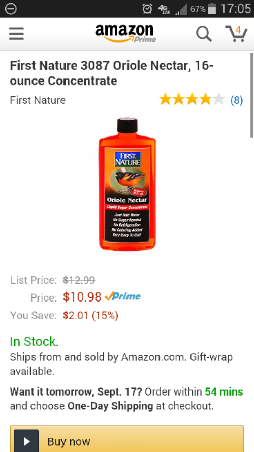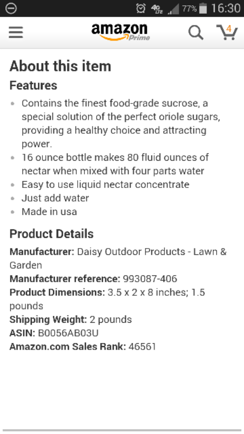 This made me slightly pissed off. Retails for $10.98. “Food grade sucrose.” Yes…otherwise known as ordinary table sugar. 12.75 cups in a 5lb bag, 4:1 ratio, 51 cups of solution (actually more, since the dissolved sugar does add volume). 51*8= 408 oz. I don’t know how much a bag of sugar costs because that would involve going to a grocery store and I don’t do that, but I’ll bet it’s not $10.98! That stuff is $0.14/oz, which would mean a bag of sugar would have to cost $57.12 to be as expensive. Even the fanciest brand name doesn’t come close, and to a bird, C12H22O11Â is C12H22O11; brand doesn’t matter!
