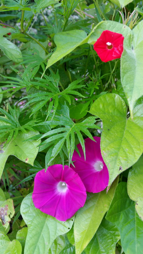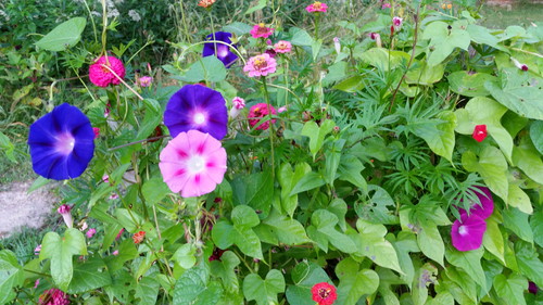 Random morning glory, zinnias, and one cardinal climber. No particular reason; they just looked pretty this morning so I walked down in my slippers to take a couple of shots.
