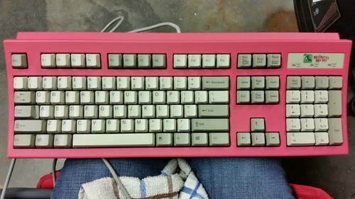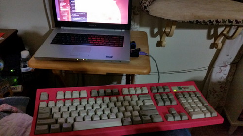 The paint is Krylon for plastic in Watermelon Pink, covered with a matte clear coat. I think I have all of the keys in the right places, but the pictures are on my S3, which was powered off, so I winged it. The first word I typed was “gedit” in the terminal. I had it on the laptop because my desktop keyboard is PS/2 and I didn’t want to try hotplugging when testing a new keyboard that I wasn’t sure would even work. Anyway, it does work, so I’ll have a bright pink (and very sturdy) keyboard on Monday!