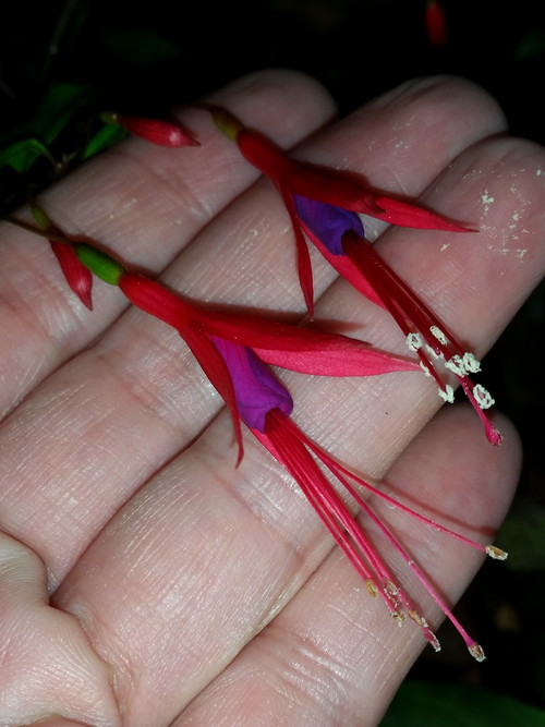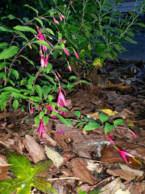 I forgot to post these of my hardy fuchsia. This is the one that didn’t get eaten. Pardon the flash; it was getting dark.