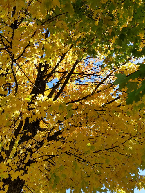I was on the wrong side to get a good shot, but the maples at work are changing colour beautifully. Only yellow and green here; can’t see the orange. Still pretty.