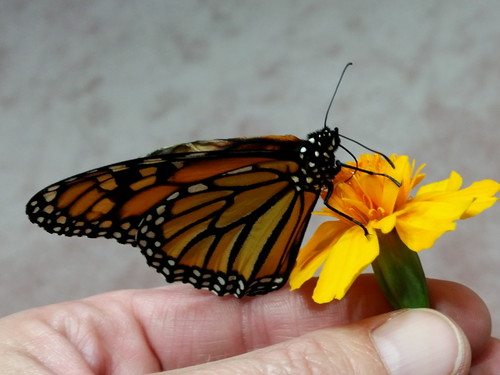 Supposed to freeze tonight, but I put sugar water on this flower to get her to drink, and I guess she can learn to use a fake flower, or even a sponge. I dunno. I don’t want to euthanize her as long as she’s taking food.