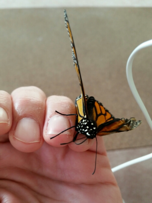 I was still in pyjamas and couldn’t go get a flower. She refused the plate with paper towel, but was content to have breakfast on my hand.
