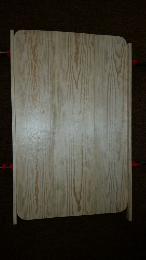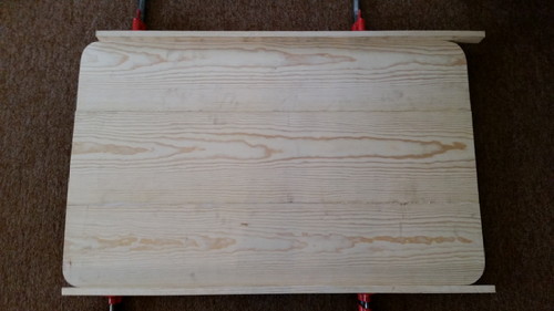 I also remembered the clamps to do my table. The corners were…fun, and the board wasn’t perfectly flat, but I think it’ll work out in the end. It wasn’t very bright when I was gluing, so I took pictures with and without the flash.