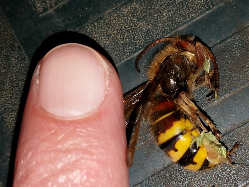 Southern Yellowjacket queen, looking for a winter home. I’m the last to kill insects and spiders (except non-native roaches and those fucking Japanese beetles…DIE-DIE-DIE!) but those bitches are aggressive, and my home is not theirs. Polistes, sure. Cicada killers, no problem. Digger wasps, welcome! Great Black Wasp, come on in! A few foraging yellowjackets I’ll ignore, but a nest? No.
