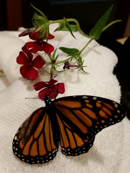 I had her on my hand and I was holding the flower so she could drink, but then I knocked over the bottle of leather deglazer that I forgot I hadn’t closed this morning, and we had to get outta Dodge because it’s basically acetone, which is what you put in a kill jar if you have an insect collection. She ended up on the kitchen counter on a towel that I’d had wrapped around the bowl of dye I used for my boot laces.