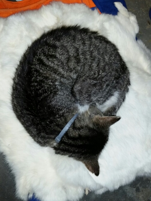 Ol’ Kitteh’s bunny furs for his bed arrived. I put them on his towels to get him used to sleeping on them. At first, they were New and Different and to be avoided entirely, then they were molten lava, then he was tired enough to put two feet on them, then all four, and then…
