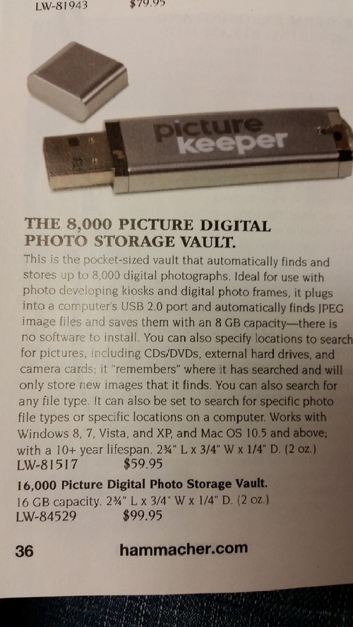 Put a generic 8GB USB 2.0 flash drive in a Hammacher Schlemmer print catalogue in 2014, call it a “Picture Keeper” so old people will know what to do with it, and tell them it’s “smart” enough to know it has pictures on it and that it won’t duplicate pictures already on it, and it costs $59.95. You can even double the size to 16GB for only $99.95–that’s a lot of shots of the grandkids!