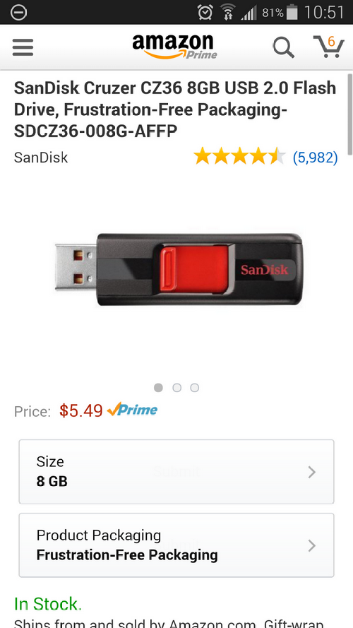 I had to specify USB 2.0 because that’s old technology that’s being replaced by USB 3.0, but I found a SanDisk that was comparable. SanDisk is a reputable brand, not some generic Chinese whatever, but close enough. When I plug this into a computer, my OS (Windows and Linux, at least, and probably MacOS, too) will recognize that it has pictures on it and ask me what I want to do, assuming I haven’t already set a default action. If I try to copy pictures from my camera or phone and those filenames already exist on the drive, my OS will ask me whether I want to skip copying those files, overwrite the existing files, or rename and duplicate. Windows and Linux (at least) will do this in plain English. Assuming I am not a drooling idiot, I’ll figure it out. Price: $5.49 and free shipping. Free two-day shipping if I have Prime.
