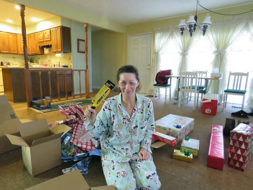 Wearing cow jammies and safety glasses, brandishing a Fat Max saw.