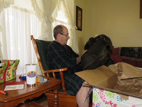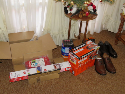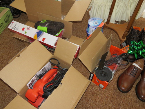 Pwresents! Including 5 lbs of Swedish Fish, a Stanley tape with Blade Armor, a vintage 70s horror book that I used to borrow from Gram, a grass hook, a sweater dryer, big fat socks, CDs and DVDs, and a mini wunderbar. Shoes not mine.