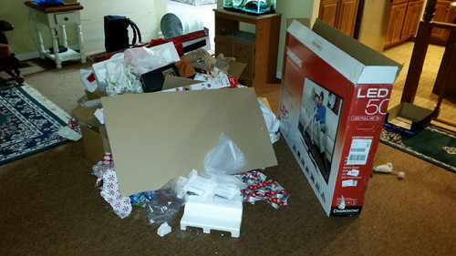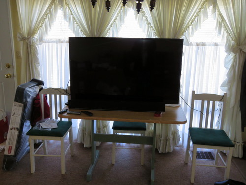 P’s TV, sound bar, FireTV and the organizer Old Kitteh got him so my rakes, shovels, forks and such aren’t in the way in the gradge.