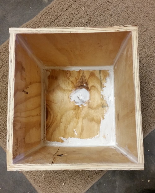 The sloppiest caulking job ever, but it was awkward in there with a caulking gun, and I wanted to make sure I got the knots and chips really well. Besides, it’s inside a planter, so meh. I’m also going to spray the inside with the sealant P got for the roof vent (there’s white left over).