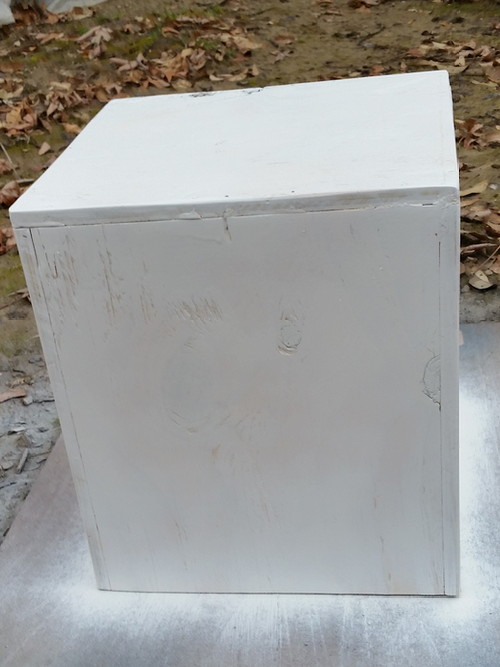 Rough sanded and sprayed with a coat (AKA “the last of my”) American Accents Ultra Cover primer. I wrote out the whole name because I liked the primer, and if I throw out the can before I get more, I’ll probably forget what it was. I’m going to try the sand texture spray I used on the mirror; hopefully it’ll be enough to hide the fact that this is made from very rough plywood in very little time. If not, I’ll get the coarser-textured stuff. No big deal.