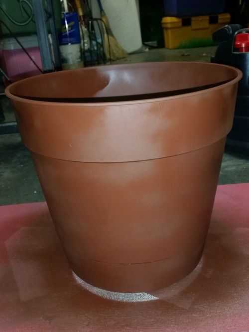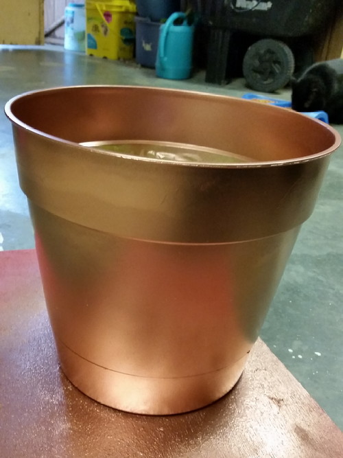 Cheap-ass avocado green Walmart pot, primed to receive a coat of copper paint.