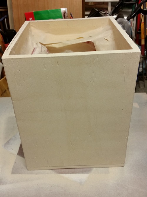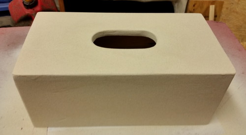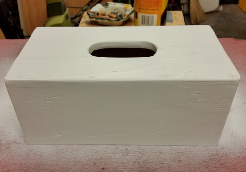 Today’s little project was a tissue box cover because I knew P wouldn’t want to remove the box of tissues from the table, but the boxes’ colours usually clash with my cream/forest green scheme. Also, it had small pieces, so it was a good Workmate test. Workmate passed with flying colours. Here it is with two coats of primer.