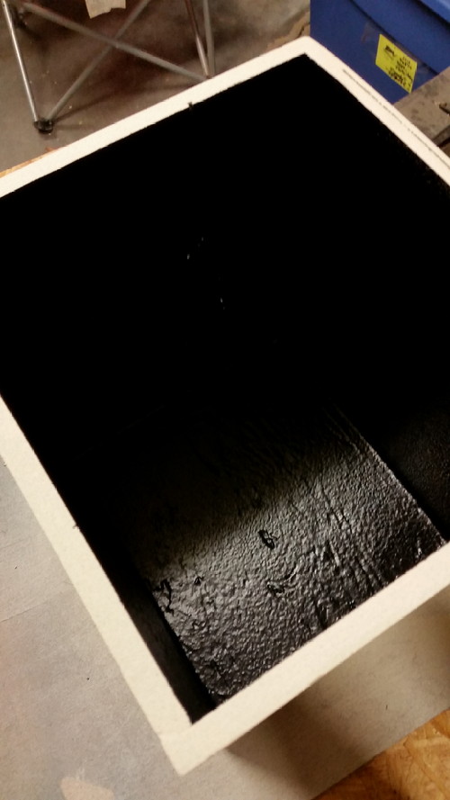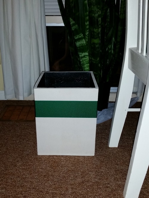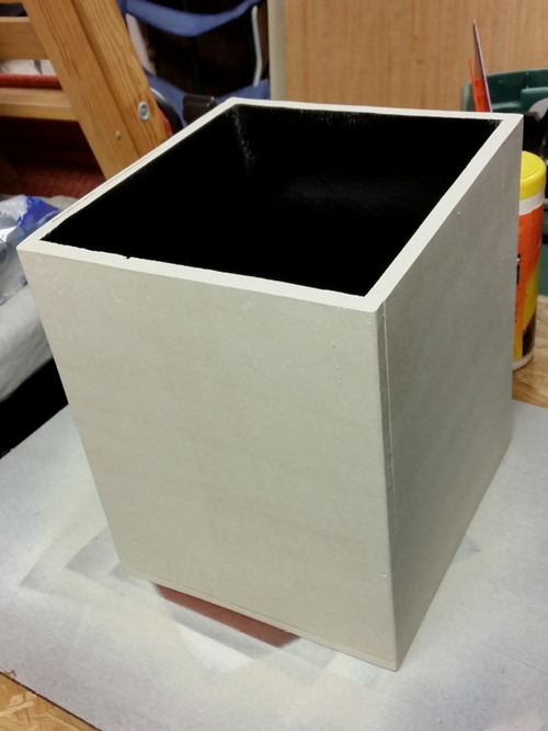 P got me two cans of Caribbean Sand textured paint yesterday; my planter isn’t smooth (because it’s rough plywood leftovers), but it looks fine for its purpose, which is to hold a sansevieria that will sit on the floor, and it’s certainly much better than the other options in that price range (leftover paint, about six bucks a can for more paint than I’ll need, caulking we already had open, leftover sealer plus the full can of black that P said I can have). For twelve bucks plus leftover stuff we already had, it looks fine. I’m also going to put a band of green grosgrain ribbon around it; I had lots left after doing the curtain tiebacks. I’ve got one more coat of paint and a coat of sealer to apply, plus the rubber sealant inside. I actually prefer black; the pot and soil will blend better.