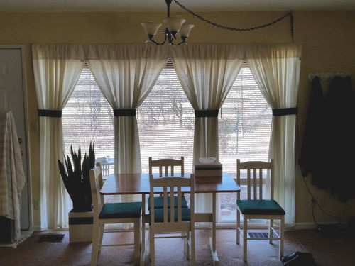 Here’s my table/chairs/curtains/light when it’s not backlit. Daylight bulbs, and I’m glad I got the three light fixture instead of the five; it’s plenty bright!