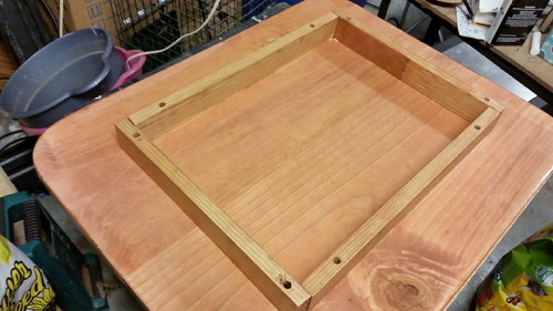 Not the prettiest thing I’ve ever seen, but I kept putting off the table beside the door because I worried about that board deciding to warp again. It straightened, but after I had stain and polyurethane on top and only stain on the bottom, I thought it might absorb moisture unevenly and bollocks up my whole project. I had the pieces left over from the edges of the table top I’d made with clear pine, so I just used that. Cut with a skilsaw when I couldn’t half-see, but good enough for underneath a table, and between the screws and Gorilla Glue, the wood shouldn’t warp. I threw a coat of stain on tonight in spite of the fact that the glue wasn’t fully dry, and I might put on a coat of polyurethane in the morning. Then, I know my tabletop will stay straight; warped board or no warped board.