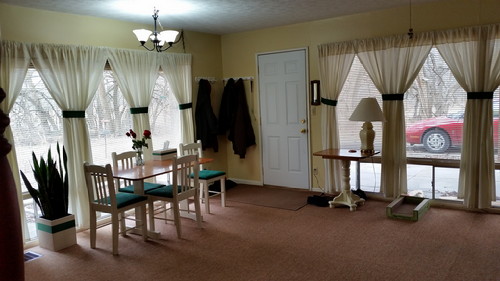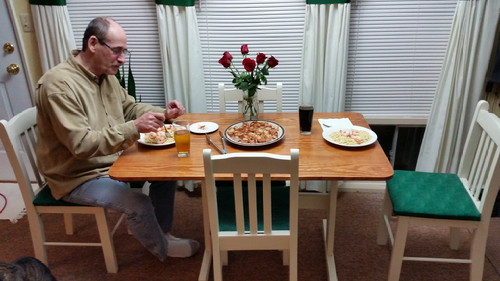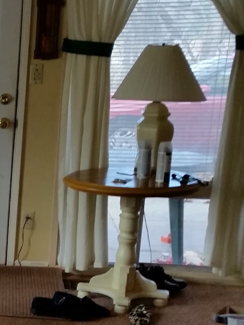 I didn’t have a picture with the round top, so I cropped this from the end of a picture I’d taken of the “kitchen” table. It’s not actually crooked–that’s just the angle–and the clutter doesn’t do it any favours, but at least the round top is visible.