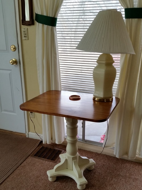 It took me forever before I was satisfied that my replacement tabletop wouldn’t warp, but my table is finally finished, and it’s perfect for that space! Now, we just need to wire the sconce light and get rid of that lamp. For now, though, I’m satisfied.