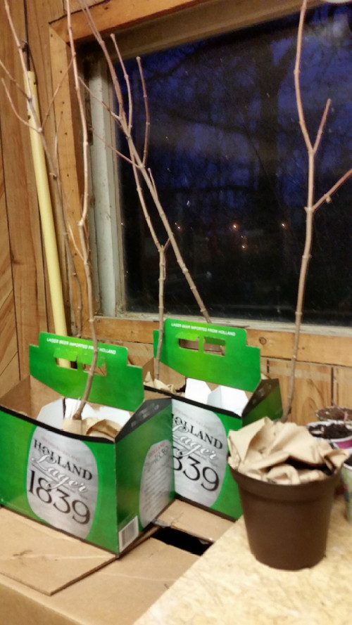Roughly a hundred years ago, P acquired a roll of brown shop paper towel. It lived in the basement forever, and for some reason, he didn’t throw it out, even when we moved. Today, when five dormant spicebush plants arrived bare root, I was glad! Spicebush hates to be moved once it’s planted, but it’s still too cold to put it right in the ground. If I potted it, it would probably start to grow new roots as the days get longer, but it wouldn’t have enough by planting time to keep the soil together once unpotted. My solution was to use the brown paper to line a pot, then fill with moist potting soil and a spicebush, and unpot. Wrap in more paper, and stand up in a six pack case. I’ll need to watch that they don’t dry out, but they’ll be fairly cool by the gradge window, and I’ll re-wet when necessary. Once I’m sure the ground won’t freeze hard again, they go in the ground, paper and all, roots undisturbed. Yay! I just hope they’ll forgive being shipped in the first place. We’ll see.