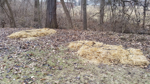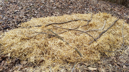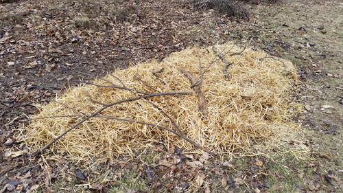 It took one bale, but my new plantings have about 3-4″ of dead leaves and 6-8″ of straw over them. In a protected area like that, I think they’ll be okay. Either way, they’re in the ground, waiting for spring to either grow or be worm food!