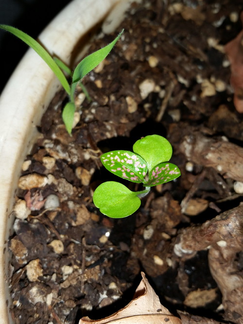 I wondered what was growing in with my Ardisia. I recognized the grass, of course, and thought the other thing must be a weed seed left over from the last time the tree was outside for the summer. Nope! It was…The Little Hypoestes That Could. I have one in the Peperomia, which was no surprise because it was right next to the Hypoestes, but the Ardisia is 2′ away. Unmistakable, though; I certainly don’t have any other plants with pink-dotted leaves!
