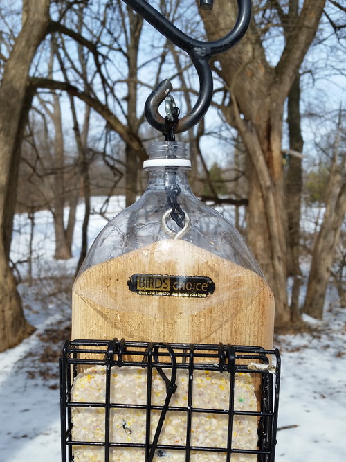 One suet feeder is starling-proof by design, and now I’ve figured out how to keep them from perching atop the tail prop feeder. One more to go…the one on the tree. It’s used a lot by my desirable birds, so I don’t want to just take it down. Anyway I don’t think starlings can perch on top of this one now, at least.
