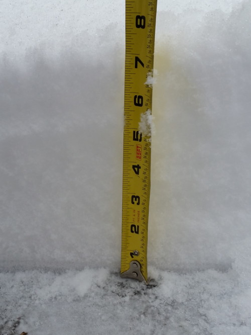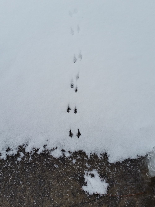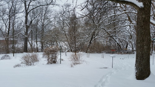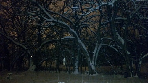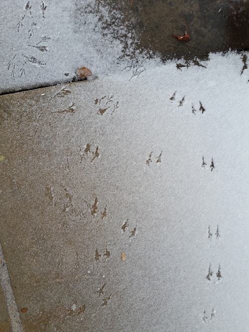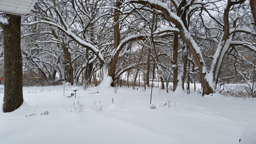 I didn’t take a photo of the serene, unspoilt white blanket in the back yard because it was criss-crossed with deer tracks (Charlotte and six of her friends were visiting last night), and my tracks from going down to brush snow off the feeders last night, and covered with enough birds to suit Alfred Hitchcock. It’s pretty, though, and we did get a little more snow after I went to bed.