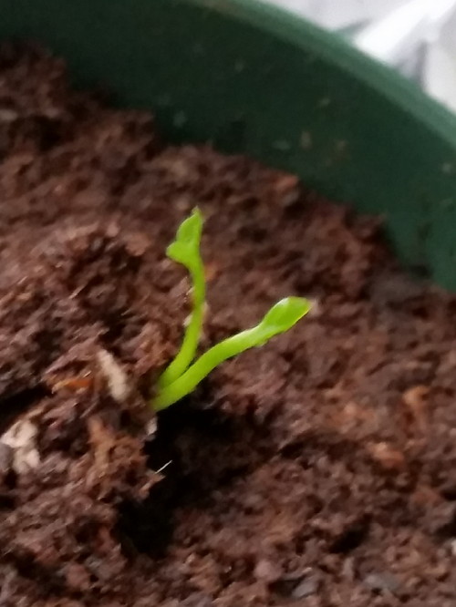 Crappy pictures, but I was using my phone, and they’re good enough to see that both of my clementine seeds have sprouted! The first one is the seed that actually had a root started on it when I put it in the pot, so it’s a little farther ahead.