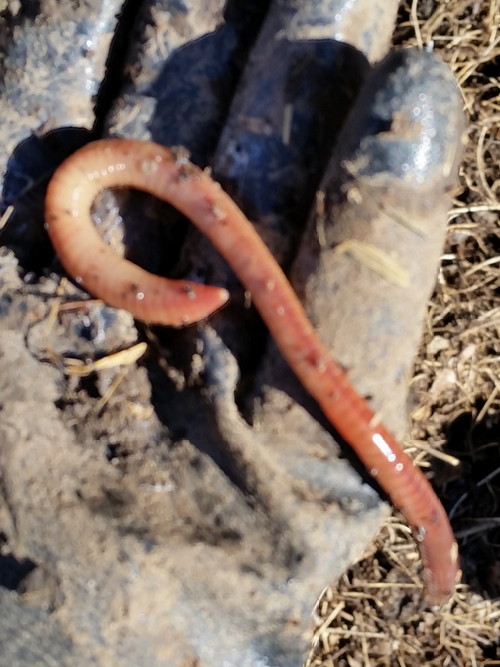 Blurry because this giant compost worm didn’t want to stay still. Fat worm. Looked a bit jittery from the coffee grounds.